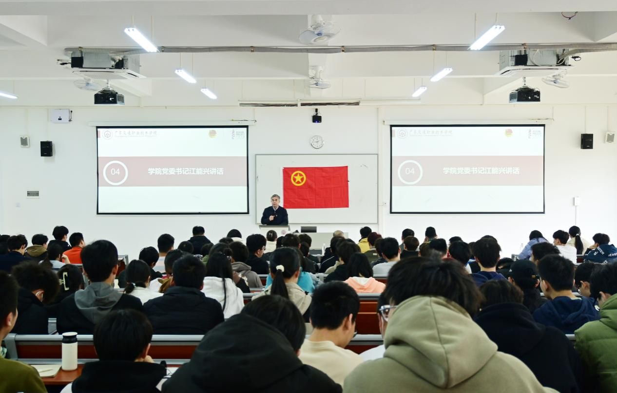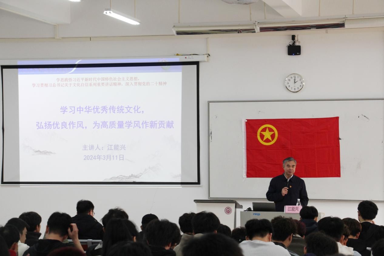 江能兴以“学习中华优秀传统文化,弘扬优良作风,为高质量学风作新贡献”为主题讲第一课,围绕习近平总书记谈人文精神、谈中华优秀传统文化、儒家人文精神、学生干部“知行合一”“事上磨炼”中修身等方面,深刻阐释了中华优秀传统文化对自身建设、内涵提升的重要性,引导青年学生骨干要深入学习中华优秀传统文化,筑牢思想根基,强化使命担当。坚持用习近平新时代中国特色社会主义思想武装头脑、指导工作,扎实推进学院各项工作高质量发展,不断取得新成效,让青春在全面建设社会主义现代化国家的火热实践中绽放绚丽之花。