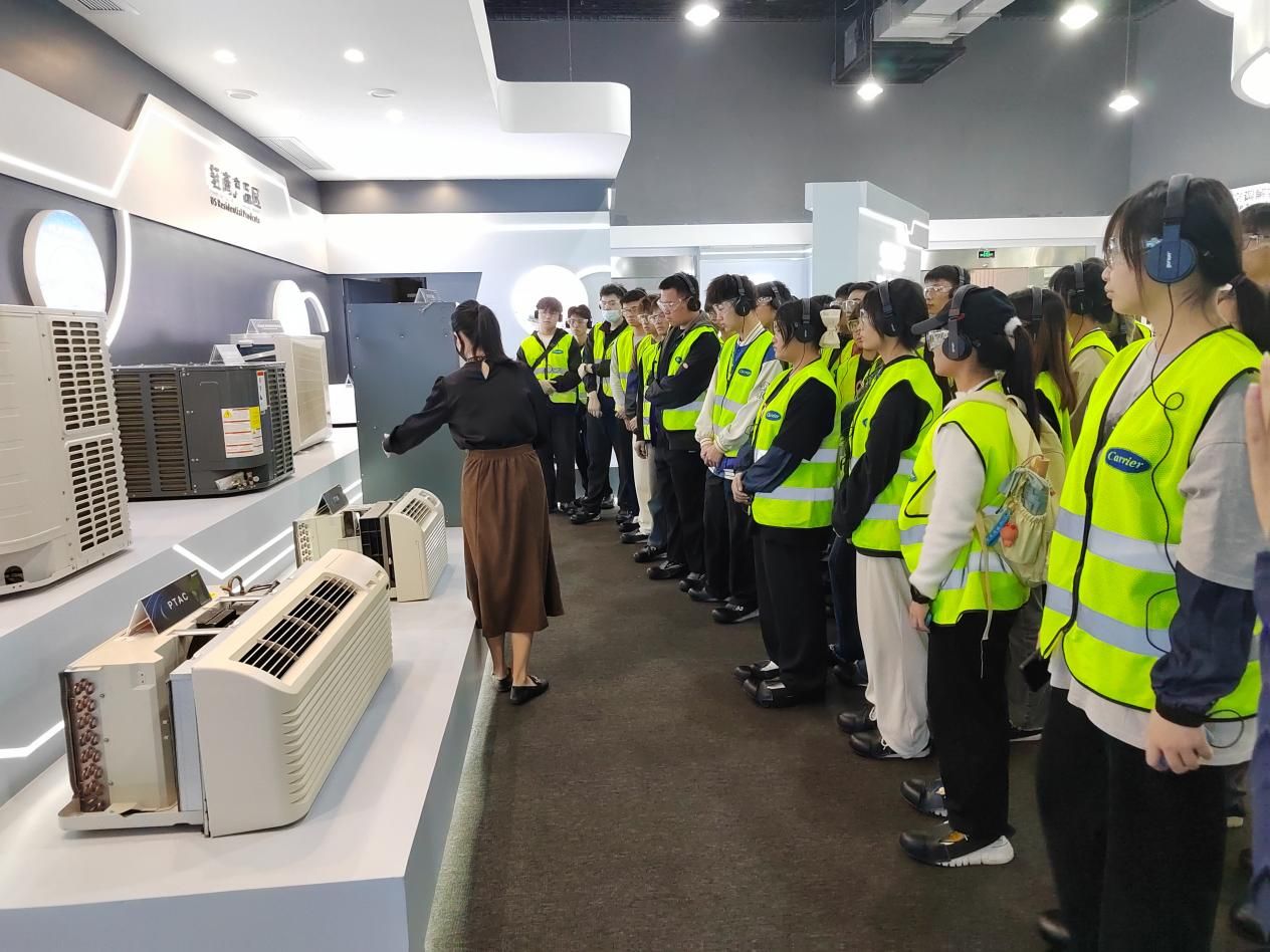 在广东开利暖通空调股份有限公司,师生们在讲解员的带领下参观了公司展厅、工作车间等,了解该公司的发展历程、产品阵容和创新成果等,更好地开阔视野、丰富阅历、增长见识。