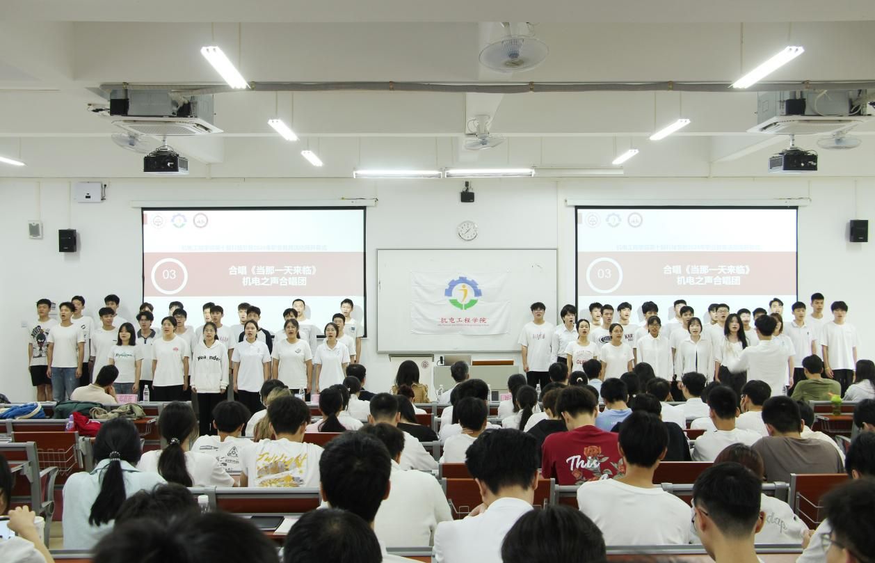 “机电之声”合唱团在刘元平的伴奏下演唱歌曲《当那一天来临》。学院十大歌手选手演唱歌曲《仰望星空》,以歌声传递着对梦想的追求,以及对美好生活的向往。学院团学骨干朗诵《盛世中国》,铿锵激昂的旋律催人奋进,激发广大青年学生爱党、爱国、爱社会主义的深厚情怀,立志做有理想、敢担当、能吃苦、肯奋斗的新时代好青年。