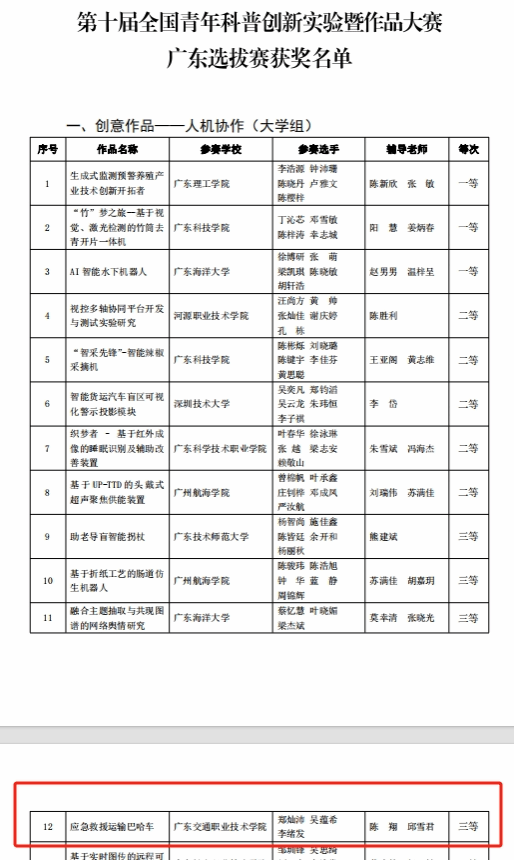 近日,由中国科协主办的第十届全国青年科普创新实验暨作品大赛;广东省科协、省教育厅联合主办,省科协事业发展中心承办的广东选拔赛中,汽车与工程机械学院陈翔老师和邱雪君老师联合指导学生郑灿沛、吴蕴希、李绪发制作作品《应急救援运输巴哈车》荣获第十届全国青年科普创新实验暨作品大赛广东省选拔赛创意作品大学组三等奖。