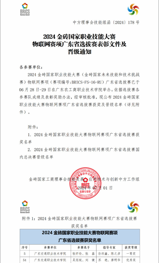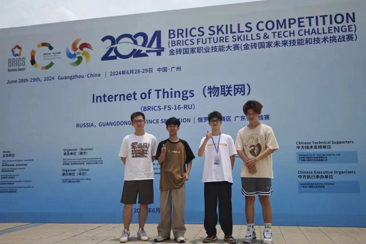 近日,2024年度金砖国家职业技能大赛(金砖国家未来技能和技术挑战赛)“物联网”赛项广东省选拔赛在广东农工商职业技术学院成功举办。威廉希尔官网智慧交通工程学院张怀伦、张磊、吴珏锐和刘健同学在苏艳、廖明华、陈之彦、孙圳鑫等老师的精心指导下,组成了两支实力强劲的队伍代表学院参赛。经过多轮紧张激烈的角逐,他们凭借出色的专业技能、默契的团队协作以及卓越的现场表现,成功摘得一等奖与优秀奖各一枚荣誉桂冠,其中一等奖队伍更是脱颖而出,获得代表广东省征战国家级赛事的宝贵资格。