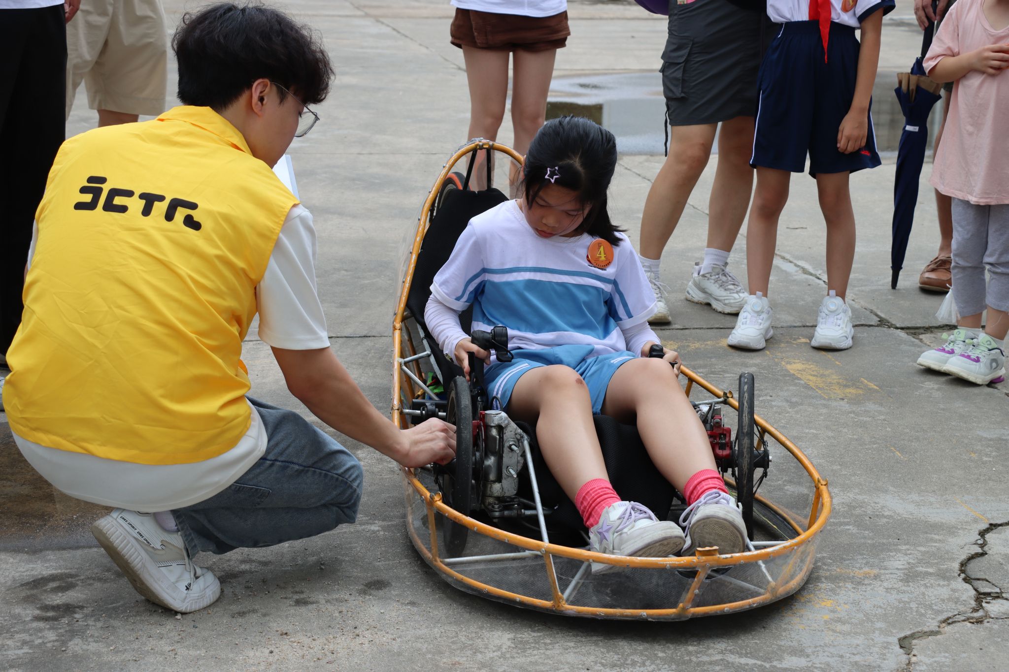 活动以汽车与工程机械学院学生创新竞赛团队——巴哈车队和EC节能车车队的赛车为载体,由学生项目团队设计策划活动内容。小朋友们参观了巴哈车队工作室,科普志愿者们给小朋友们介绍了巴哈越野赛车的设计制作流程,并展示了车队自主加工制作的零配件。同时,向小朋友和家长们宣讲了赛车制作和竞技赛事的“挑战”“不服输”的精神。