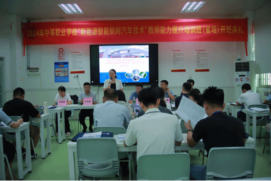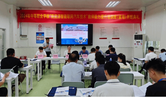 近日,由威廉希尔官网汽车与工程机械学院承办的广东省2024年中等职业学校“新能源与智能联网汽车技术”教师能力提升培训班(省培)顺利开班。学院继续教育学院副院长陈琳,汽车与工程机械学院院长郭海龙、副院长张胜宾、综合办主任刘海萍、项目负责人黄景鹏、班主任何明等老师,以及来自全省24所中职学校的30名汽车专业骨干教师出席开班仪式,开班仪式由该项目负责人黄景鹏老师主持。