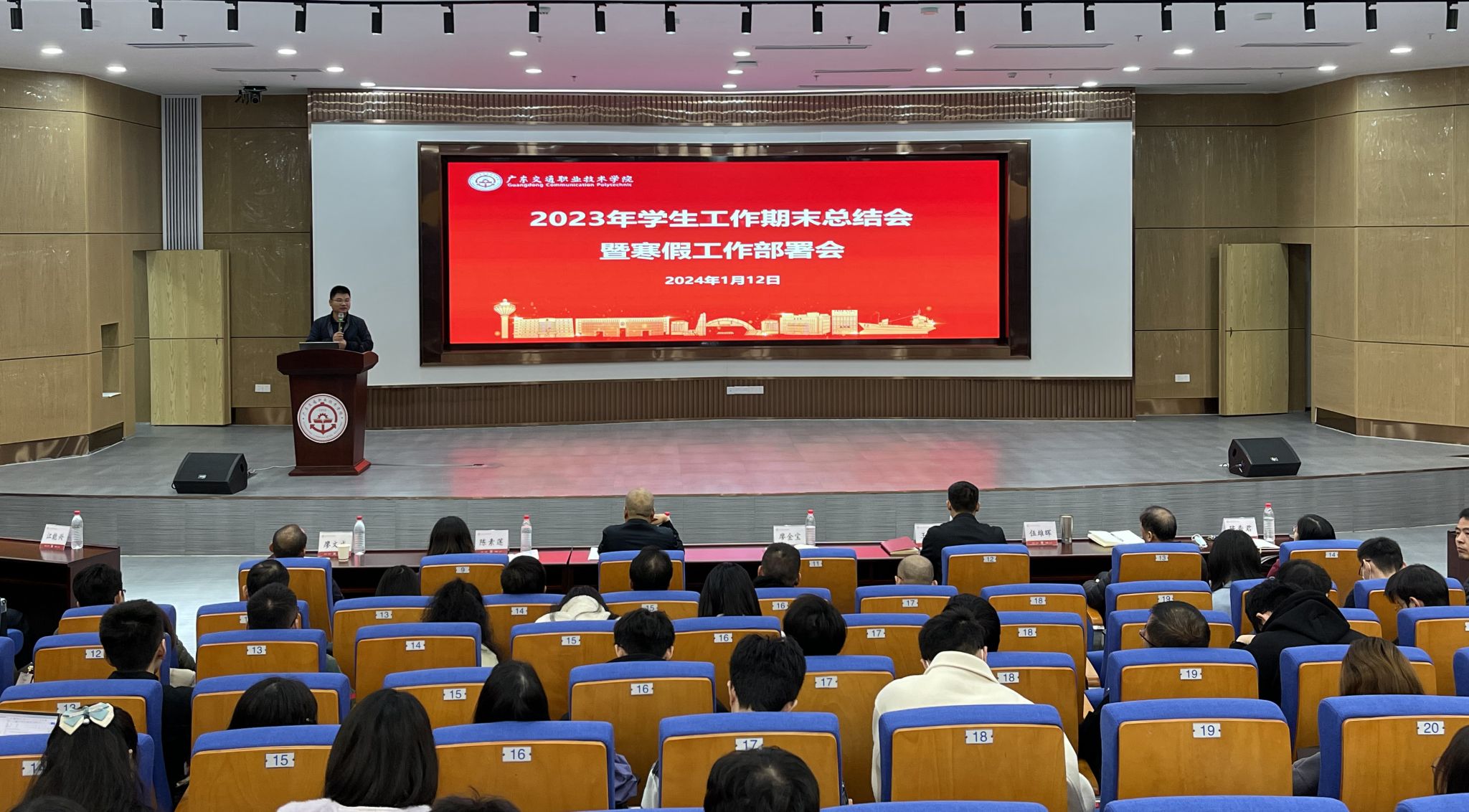1月12日,2023年学生工作期末总结会暨寒假工作部署会在清远校区图书馆一楼学术报告厅召开。学院党委副书记廖金宝,各二级学院党委书记、副书记,全体辅导员及党委学生工作部、团委全体工作人员参加会议。会议由党委学生工作部副部长钟海生主持。