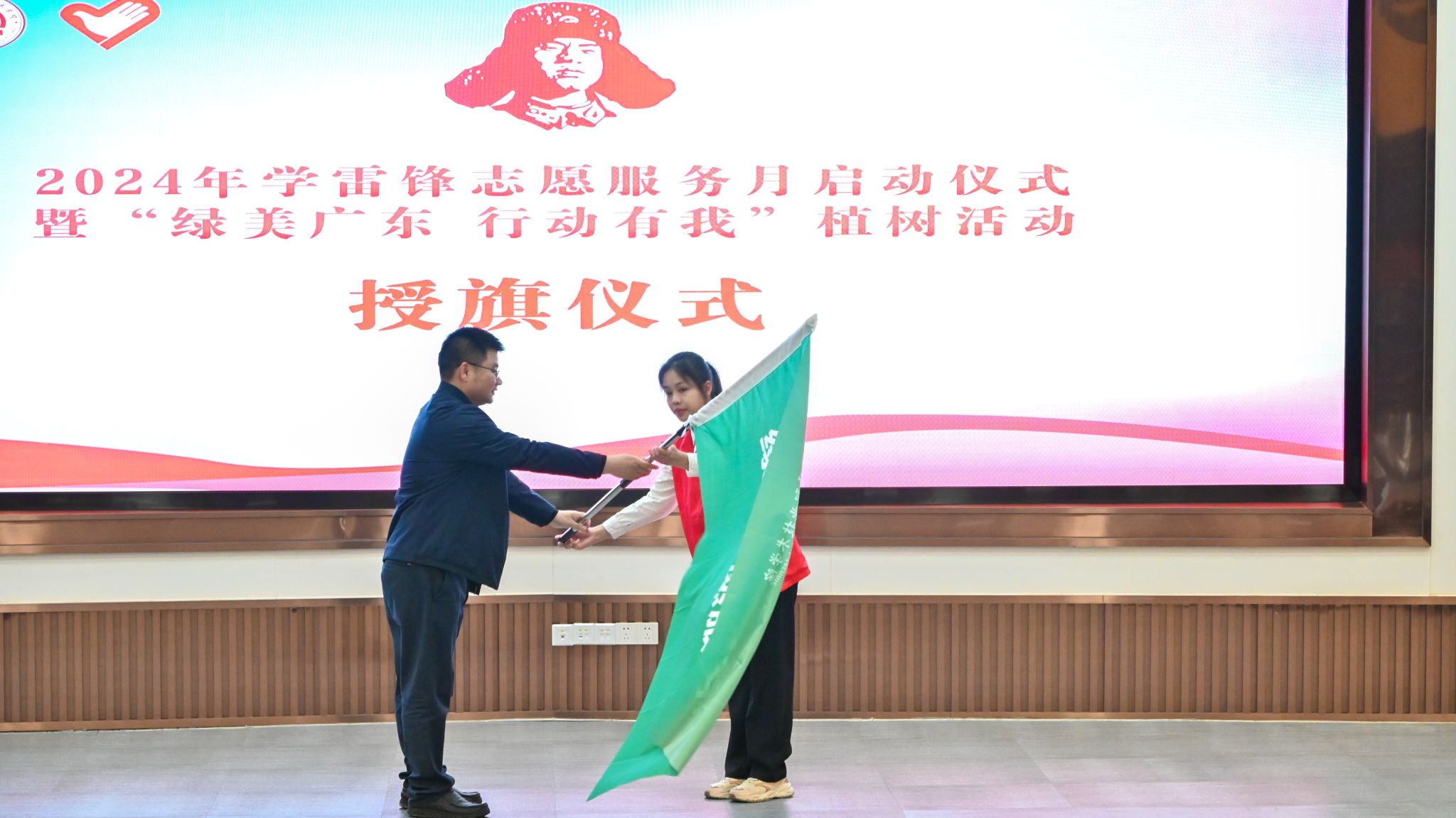 廖金宝勉励青年志愿者们要积极响应时代号召,以党和国家发展需要为己任,在实践中锤炼过硬本领,并提出三点希望:一是厚植志愿精神,当好新时代雷锋精神传承者,用行动诠释广交担当;二是要勇担时代重担,争做大学生“百千万工程”突击队排头兵,为助力广东乡村高质量发展贡献广交智慧;三是要践行绿色发展,争当绿美广东建设者与守护人,为广东进一步擦亮高质量发展绿色底色贡献广交力量。廖金宝还为学院大学生绿美志愿服务队授旗。