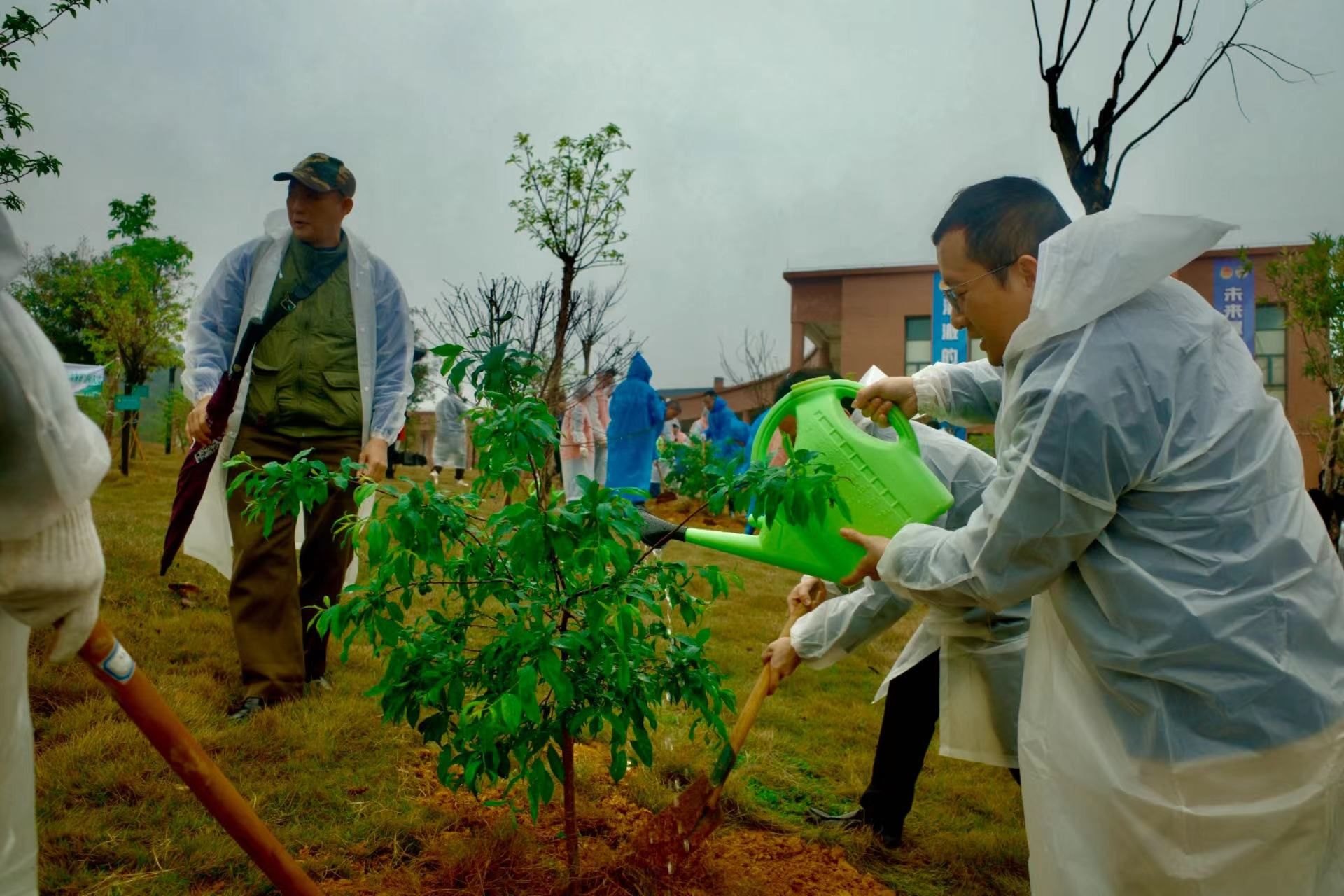 植树现场,春雨绵绵,大家身着雨衣,热情不减,干劲十足,纷纷撸起衣袖,有的铲土造坑、有的扶正树苗、有的培土围夯,师生们分工协作,默契配合,呈现一片热火朝天的和谐画面。罗毅充分肯定了本次植树活动的意义和形式,他讲到,十年树木、百年树人,树苗要长得好,不仅要种的好,还要给予好的环境和充足的养分,青年大学生培养也是这个道理,既要帮助他们扎好根,又要润物细无声地栽培才行!