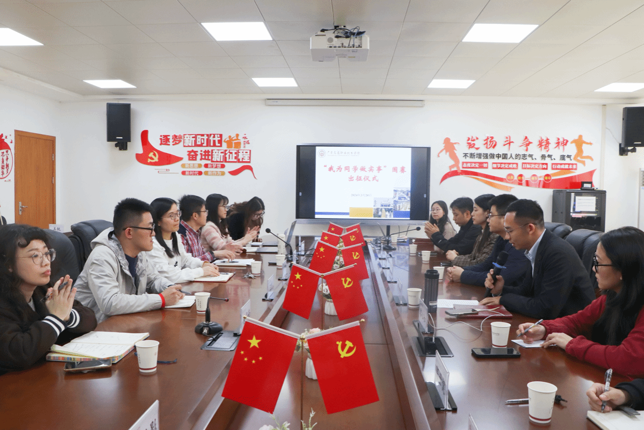 为强化学生工作优秀品牌项目的引领示范作用,激发威廉希尔官网团学工作人员干事创业热情,3月20日,学院在清远校区明德楼305会议室举行全国高校学生会组织“我为同学做实事”项目交流展示活动出征仪式。学院党委副书记廖金宝,团委书记王铿崎、副书记刘一苇,信息学院党委书记陈秀君、副书记陈振宇、全体辅导员和参赛学生代表参加出征仪式。出征仪式由王铿崎主持。