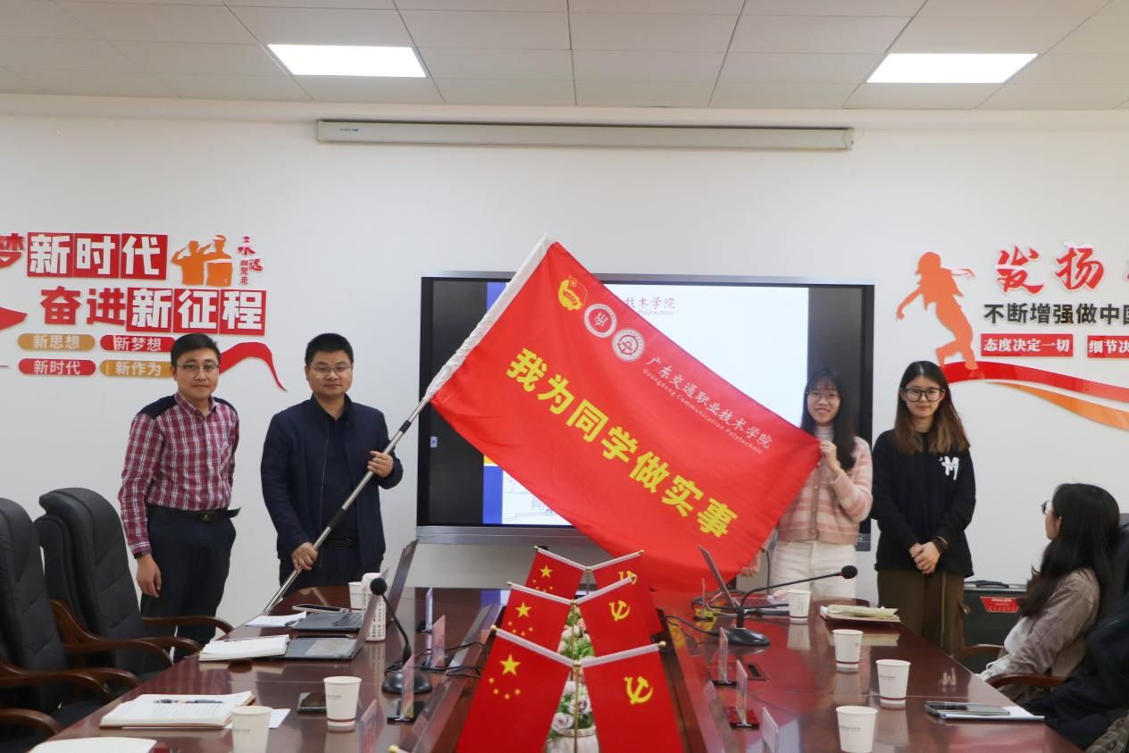 廖金宝在讲话中指出,近年来学院深耕教育教学改革和人才培养,多措并举将学生会建设成为服务广大学生成长成才的平台。本次“芯·青年”成长驿站跻身“我为同学做实事”国赛展示平台,是学院深化共青团改革和学生会改革中的重要标志性成果。他鼓励项目团队成员要轻装上阵、奋勇拼搏、全力以赴、突破自我,在全国性平台展现好广交智慧和广交方案,争取获得更好的成绩。要以本次活动为契机,持续深入探寻学生服务工作中更多的先进案例,并通过比赛、交流活动多种途径展示威廉希尔官网人才培养成效,为助力学院“双高”建设作出更多新的贡献。廖金宝还为本次“我为同学做实事”外出参赛团队授旗。