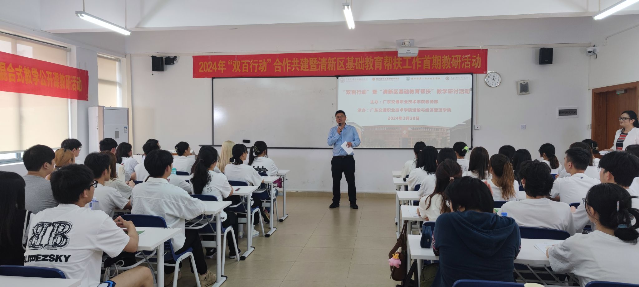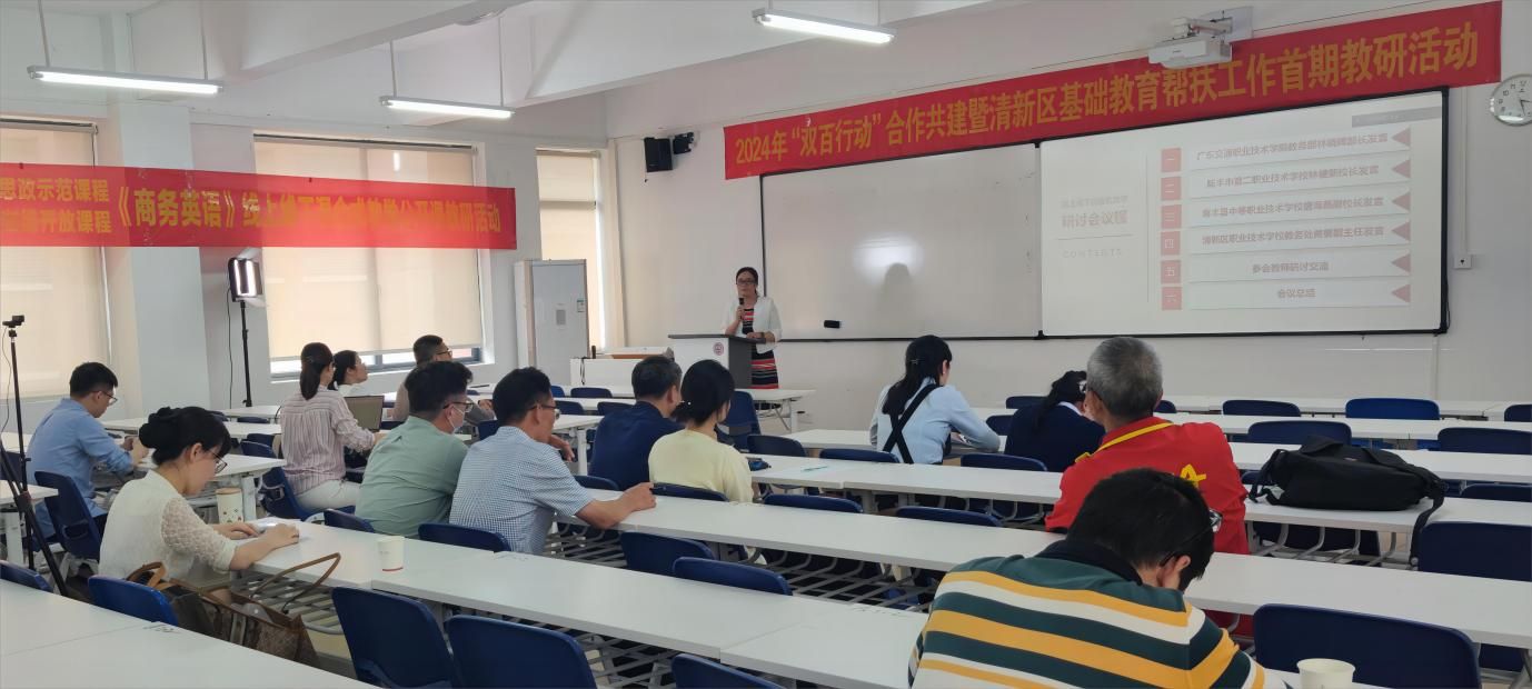 为深入推进“双百行动”,联动基础教育帮扶,助力汕尾陆丰市、海丰县、清远清新区高水平中职学校建设,3月28日下午,学院教务部、运输与经济管理学院共同举办2024年“双百行动”合作共建暨“清新区基础教育帮扶”工作首期教学研讨活动。学院教务部部长林晓辉、陆丰市第二职业技术学校校长林健新、海丰县中等职业技术学校副校长唐海燕、清远市清新区职业技术学校教科研教务处副主任黄葵等出席活动。活动以线上线下相结合方式进行,由运输与经济管理学院院长王龙主持,国际经济与贸易专业骨干教师熊祖娟担任公开课主讲人,运输与经济管理学院全体教师、其他二级学院教师代表及三所中职学校相关专业骨干教师参加活动。
