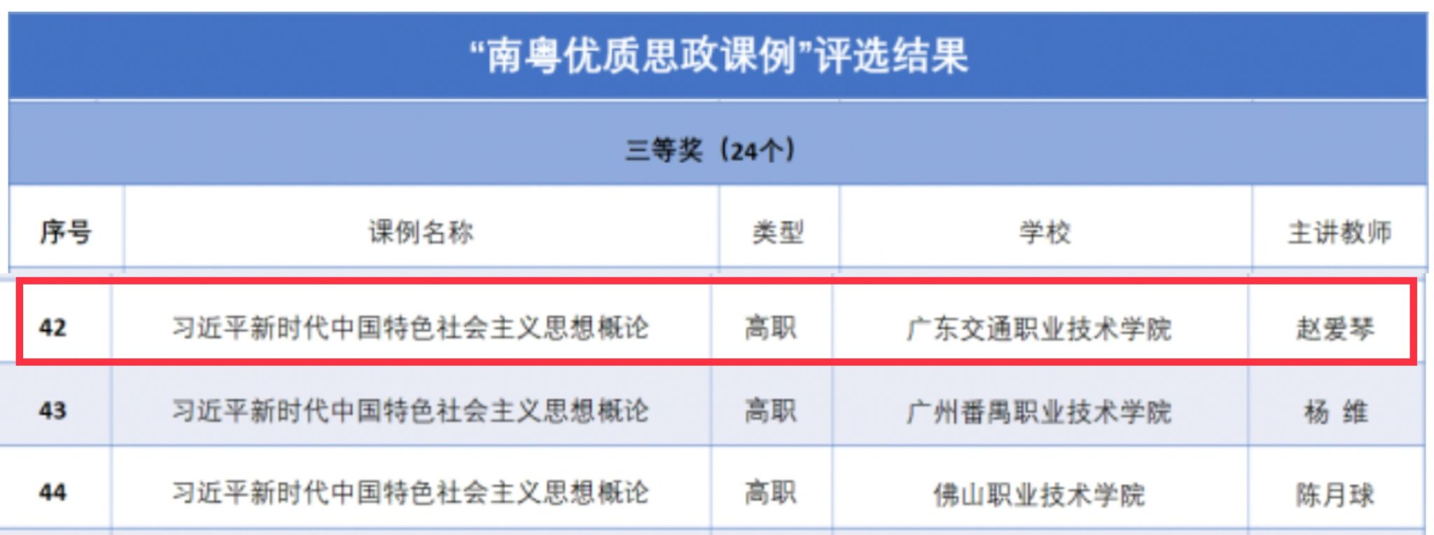 4月15日,广东省教育厅公示“南粤优质思政课例”。根据《广东省教育厅关于开展“南粤优质思政课程”评选活动的通知》,全省共评选出优质课例50个,威廉希尔官网马克思主义学院赵爱琴团队的《习近平新时代中国特色社会主义思想概论》课程荣获三等奖。