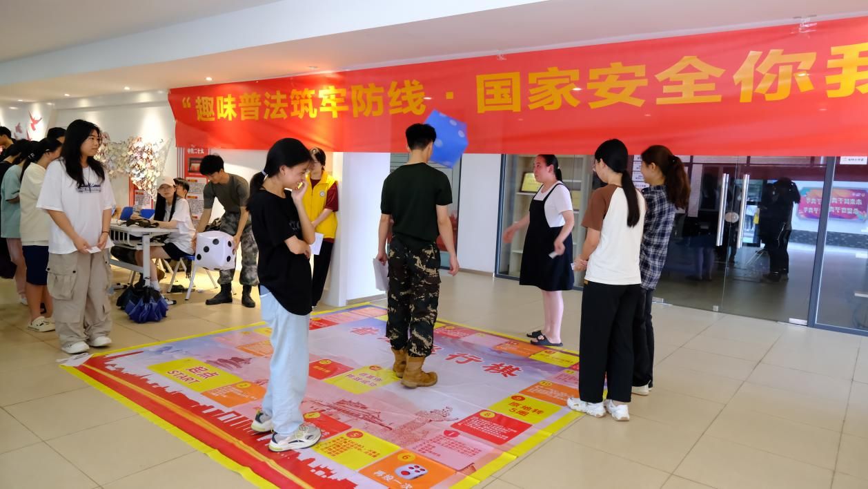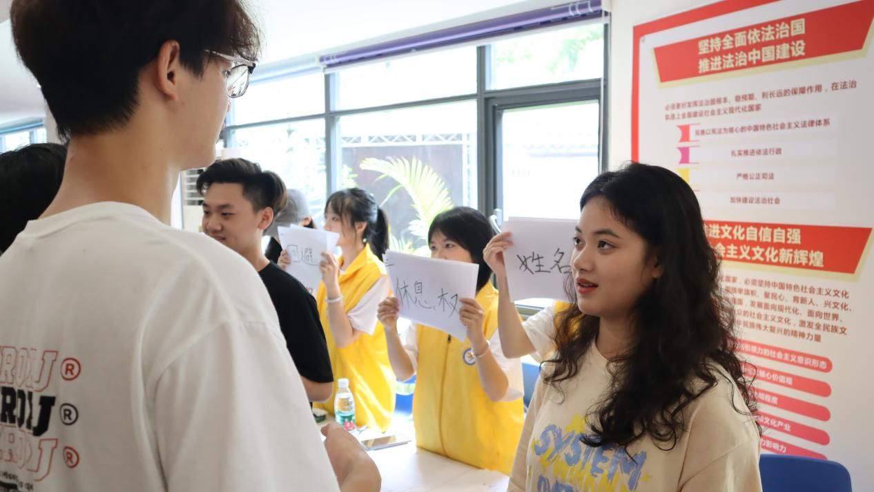 活动现场,学生带着积分卡穿梭于不同摊位中沉浸式游玩,法“豸”青年社会实践团队成员化身普法小达人,引导同学们在法条传声筒、你演我来猜、法治飞行棋等8个游戏摊位学习《中华人民共和国民法典》《中华人民共和国反电信网络诈骗法》等多部与日常生活息息相关的法律。