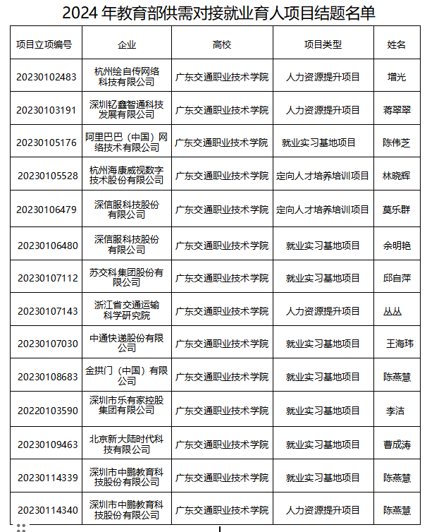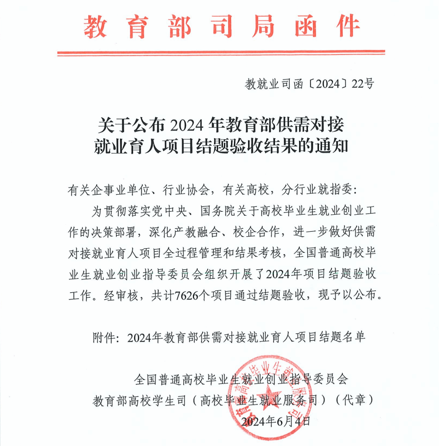 近日,教育部供需对接就业育人项目平台发布了《关于公布2024年教育部供需对接就业育人项目结题验收结果的通知》(教就业司函〔2024〕22号),学院与阿里巴巴(中国)网络技术有限公司等9家用人单位对接的12个项目顺利通过2024年教育部供需对接就业育人项目结题验收。